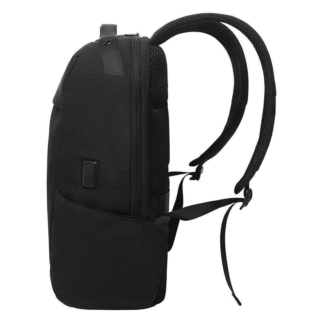 Ranac sa jednim glavnim odeljkom, naloženi odeljci za tablet i laptop veličine ekrana 15″, džep sa rajsferšlusom napred i dva džepa sa strane, USB konektor