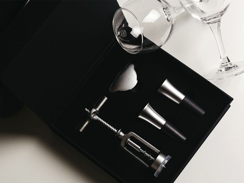 Vinski set sadrži – otvarač flaše, dva umetka za sipanje i rezač folije
