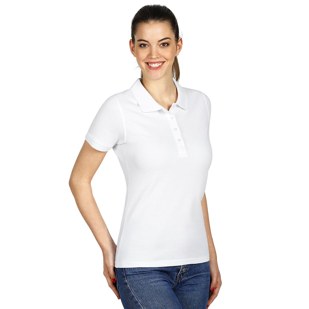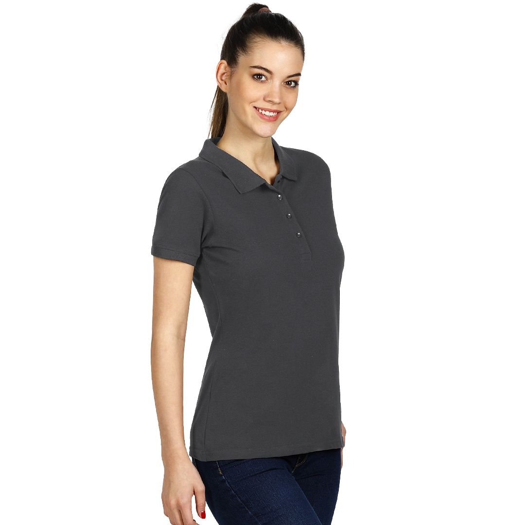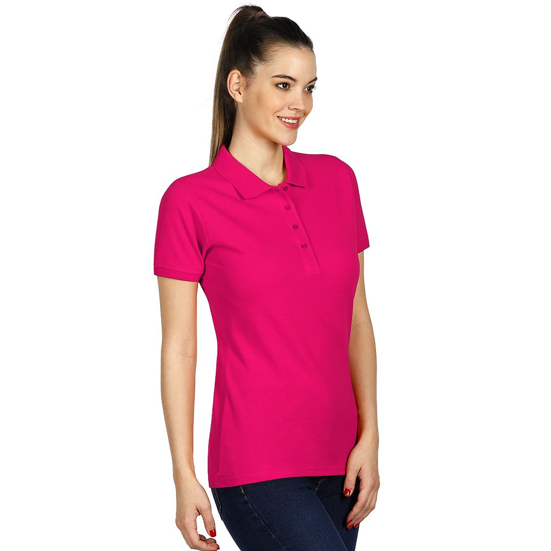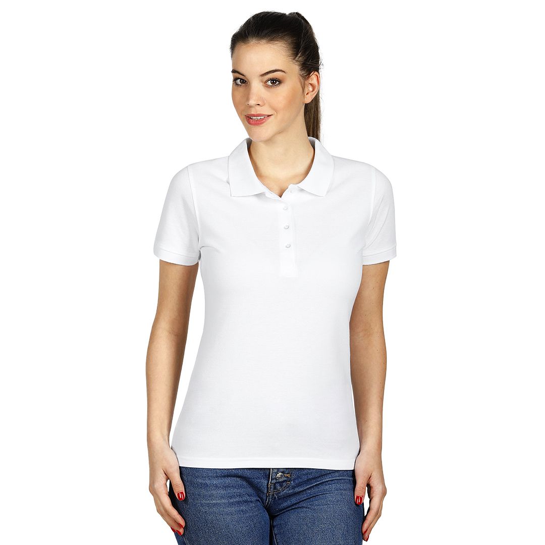 Ženska polo majica, 180 g/m2, blago strukirana, šivena sa strane, dupli štep na dnu, ranfle oko rukava, četiri dugmeta u boji majice, rezervno dugme, ojačana trakom duž vrata i dodatnim štepom duž ramena