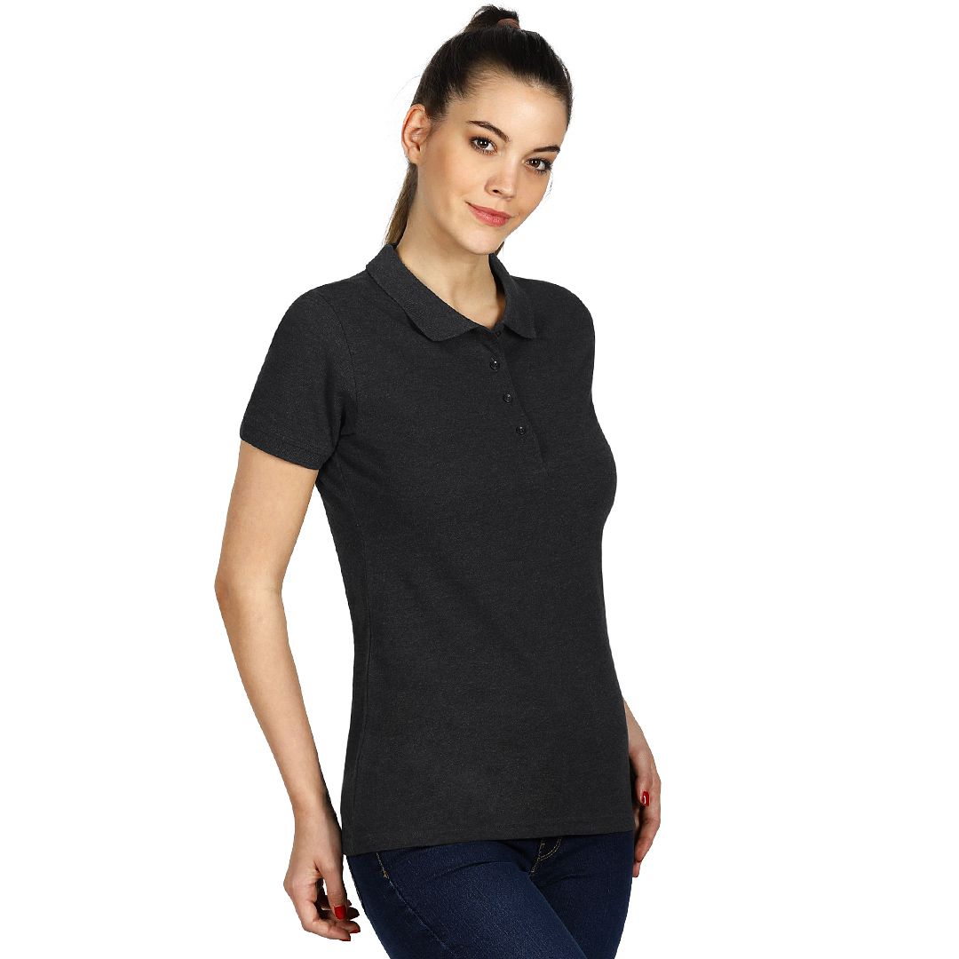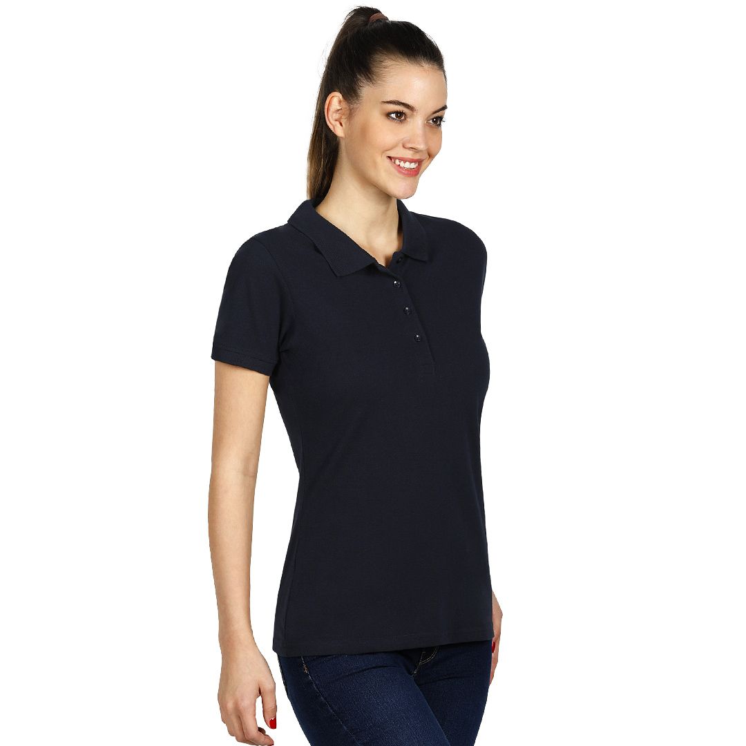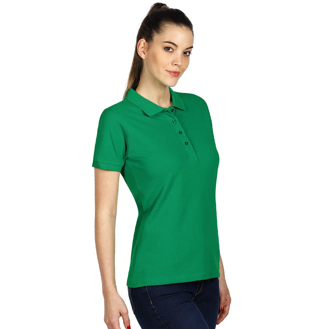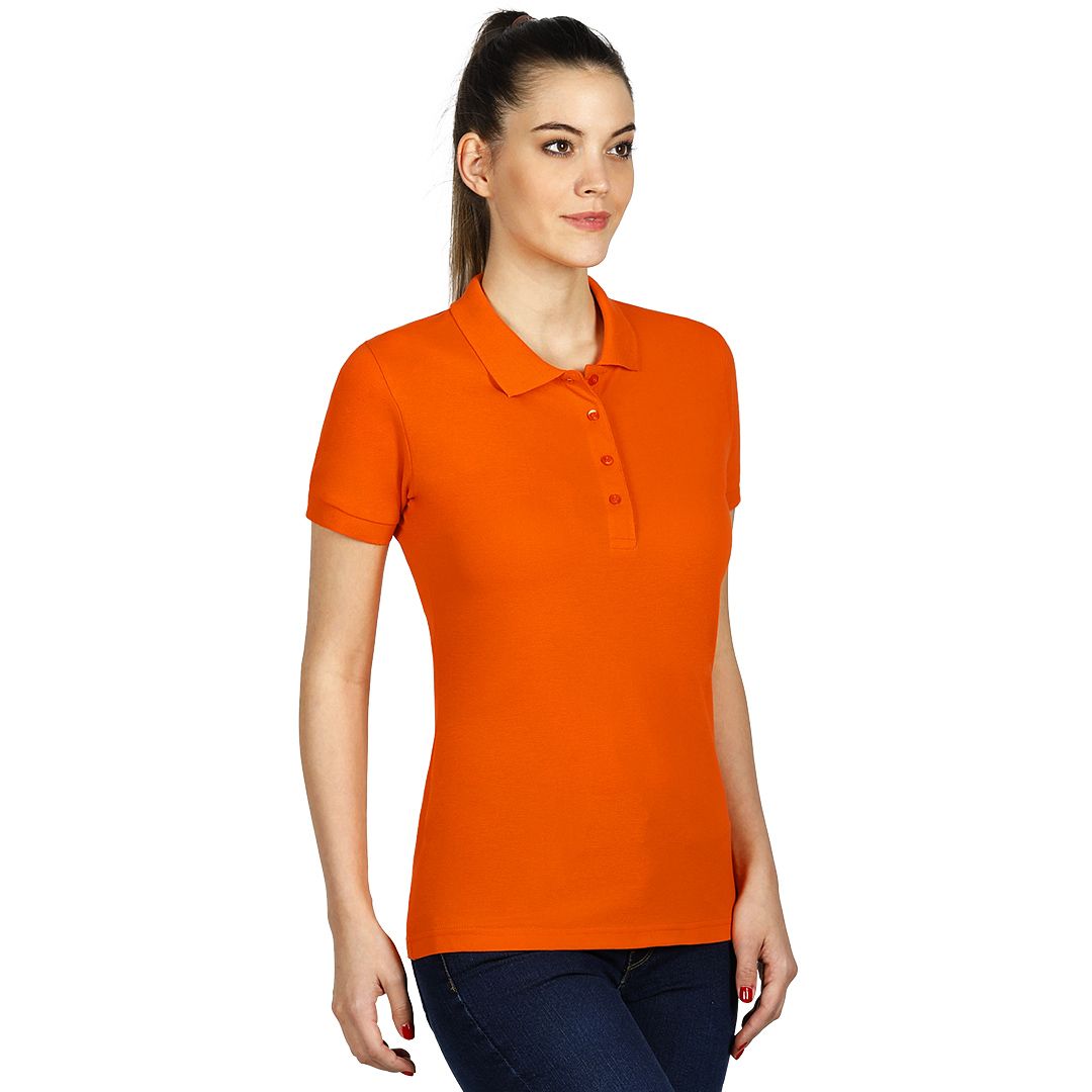 Ženska polo majica, 180 g/m2, blago strukirana, šivena sa strane, dupli štep na dnu, ranfle oko rukava, četiri dugmeta u boji majice, rezervno dugme, ojačana trakom duž vrata i dodatnim štepom duž ramena